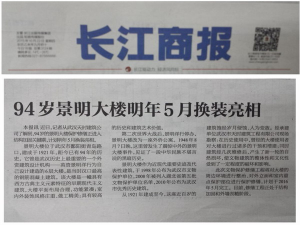近期,长江日报、长江商报、����� �������Ƴ������������ �������Ƴ������������ �������Ƴ�������武汉晨报等多家本地媒体相继����� �������Ƴ������������ �������Ƴ�������对天时公司黄鹤楼、园博园“汉口里”、景����� �������Ƴ������������ �������Ƴ����������� �������Ƴ������������ �������Ƴ�������明大楼等古建修复、外装工����� �������Ƴ������������ �������Ƴ�������程项目进行报道。充分肯定天时����� �������Ƴ������������ �������Ƴ�������公司在古建修复方面的精湛技����� �������Ƴ������������ �������Ƴ������������ �������Ƴ������������ �������Ƴ�������艺,及为提升城市历史文化品味作出的不懈����� �������Ƴ������������ �������Ƴ������������ �������Ƴ������努力。
